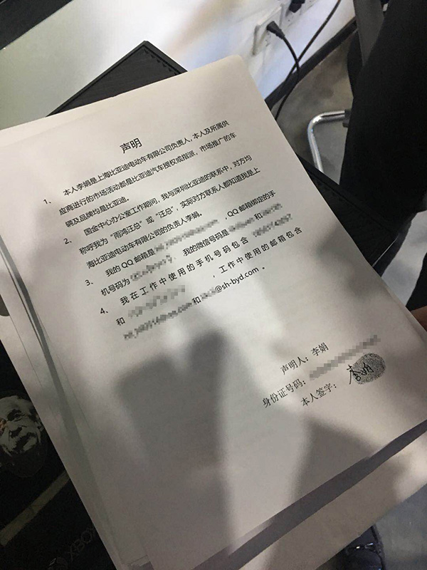 阮姓副總裁在現(xiàn)場出示的一份有“李娟”字樣簽名,且附有指紋的聲明中還提到,在與深圳比亞迪的聯(lián)系中,對方均稱呼“我為雨鴻汪總或汪總,實際對方聯(lián)系人都知道我們上海比亞迪電動車公司的負責人李娟。”