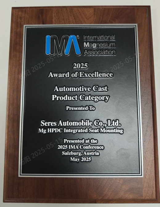 在奧地利舉辦的第82屆世界鎂業大會上,賽力斯集團的“鎂合金一體化高壓壓鑄座椅支架件”項目榮獲國際鎂協(IMA)2025年度“優秀汽車鑄件獎”。這體現了賽力斯在材料科學和制造工藝上的持續創新突破,標志著賽力斯在鎂合金汽車應用領域已躋身全球領跑者行列。