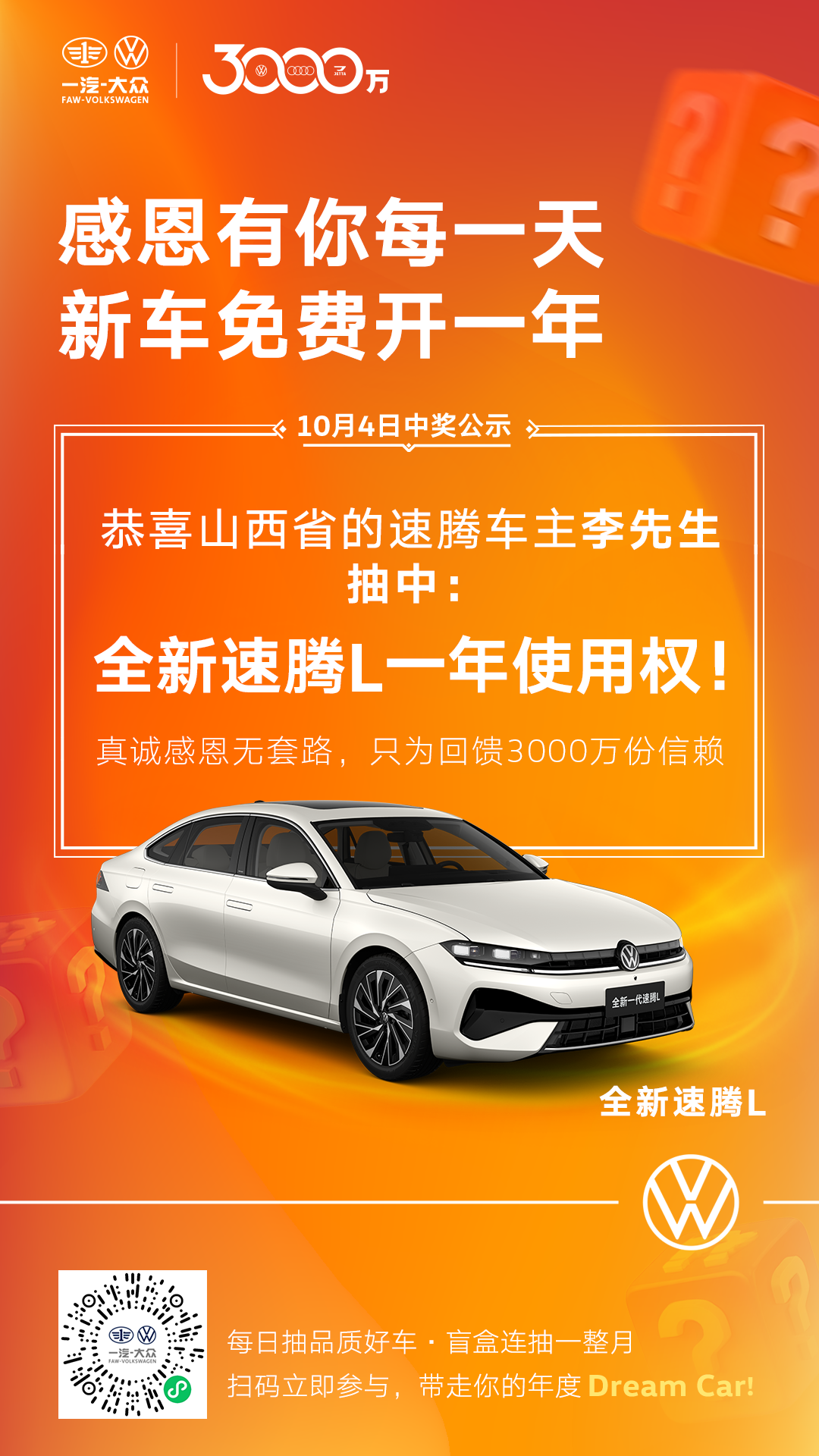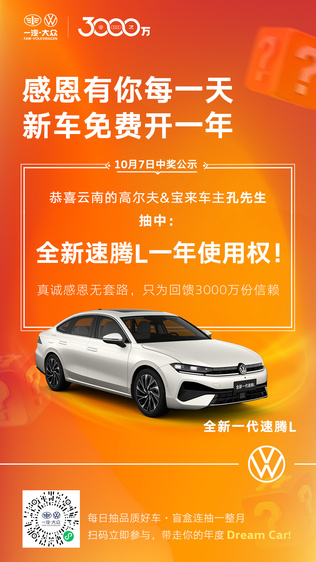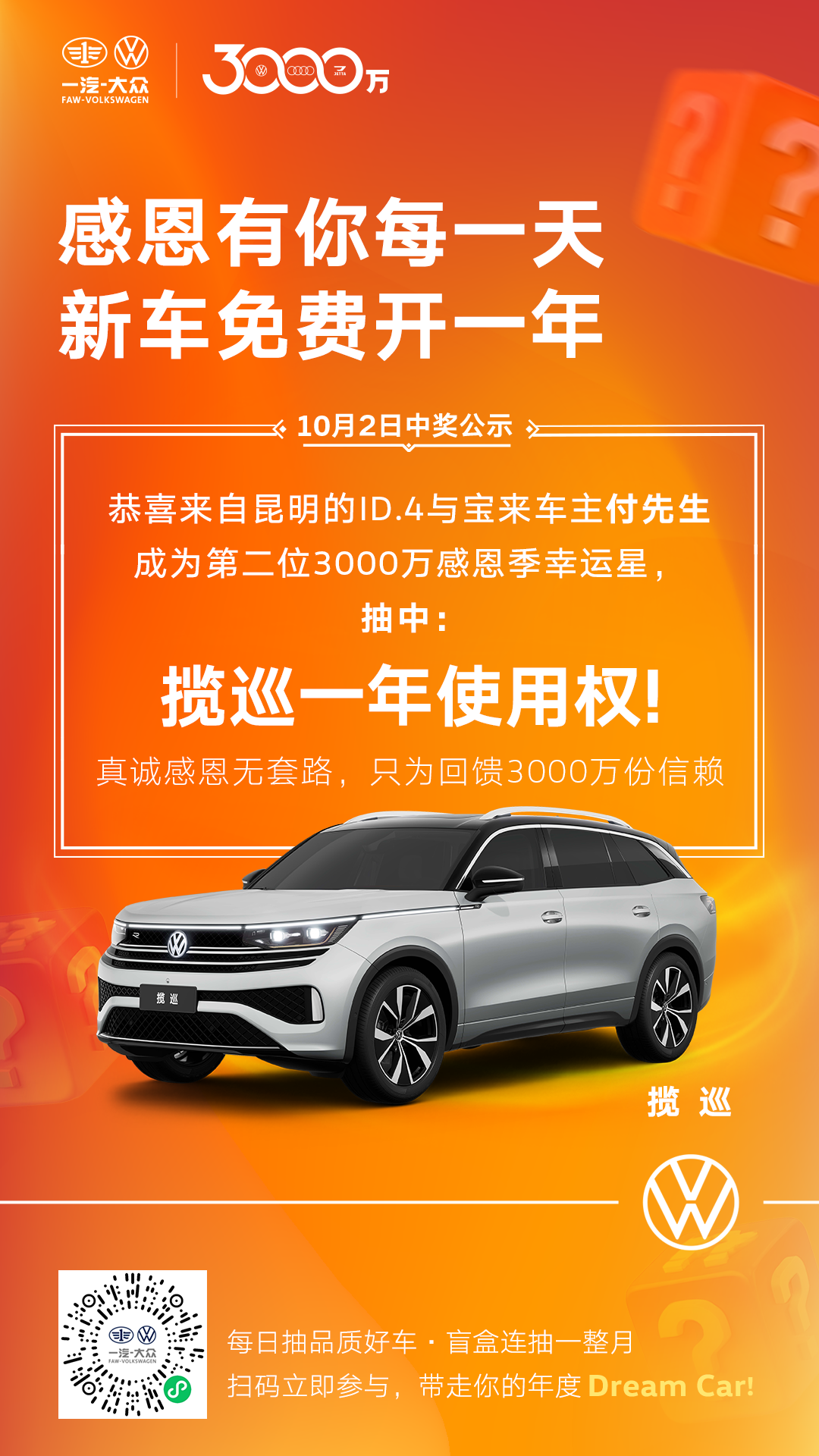 規模之上是責任,這份責任既是對品質的堅守,也是對客戶的承諾,一汽-大眾將“可靠”從產品品質延伸至服務領域。為答謝3000萬客戶的支持與信賴,一汽-大眾特別推出“3000萬用戶感恩禮”——車主報名抽取新車“免費開一年”使用權,大眾品牌吸引超過64000位車主報名參與。十一長假期間共誕生八位“幸運星”,分別獲得全新攬境、攬巡、全新探岳L、全新一代速騰L及全新一代邁騰車型的一年使用權。目前該活動仍在火熱進行中,10月27日前仍可報名參與。