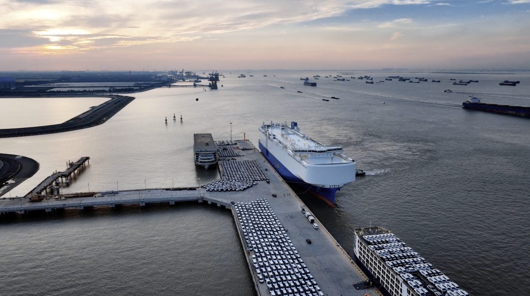 圖為上海海通國際汽車碼頭,奇瑞出口車輛整裝待發