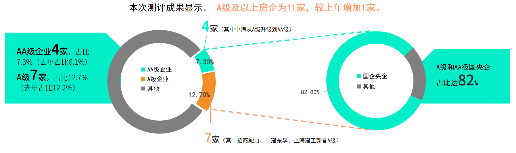 其中,11家ESG評級A級及以上的房企中,龍湖集團和綠城中國是民營房企,其他9家是央國企,或有國資背景的混合所有制企業,民營企業占比僅為18.2%。