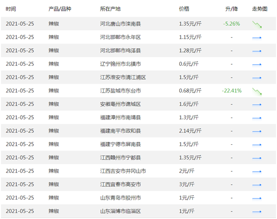 在豬肉價格下跌的同時,辣椒價格也迎來了一輪快速跳水。惠農網大數據顯示,5月25日,河北、遼寧、江蘇、安徽、福建、江西、山東等多地的辣椒現貨價格已經跌至1元/斤至2元/斤的區間內。其中,江蘇鹽城的辣椒現貨受新貨上市影響,一度大跌22.41%,批發價格跌到0.68元/斤。