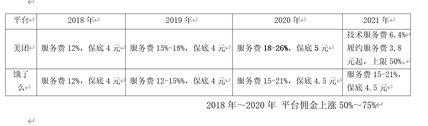 事實上,面對餐飲行業出現的負增長及從業人員的呼吁,2021年,美團、餓了么等平臺開始進行費率改革。