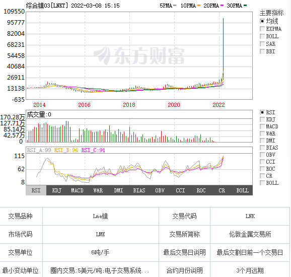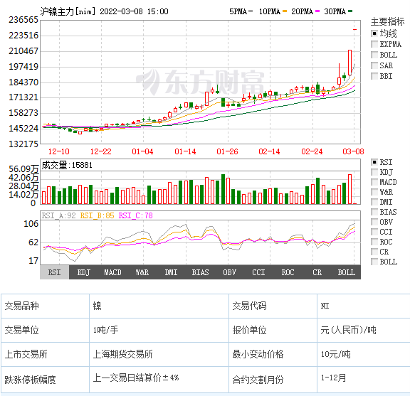 東方財富CHOICE終端顯示,截至3月8日15:00收盤時,上海期貨交易所鎳主力合約(以下簡稱:滬鎳)報228810元/噸,大漲29840元/噸,漲幅為15%。分析人士認為,鎳作為新能源金屬存在結(jié)構(gòu)性供求矛盾,當前去庫存速度加快,疊加地緣政治擾動,共同推動鎳價短期沖高。業(yè)內(nèi)人士認為,鎳價大漲對探礦采掘、金屬回收等產(chǎn)鎳企業(yè)構(gòu)成利好,但對新能源電池、不銹鋼生產(chǎn)等用鎳企業(yè)構(gòu)成沖擊。當下用鎳企業(yè)正積極發(fā)掘海外資源,認真研究循環(huán)再生模式。