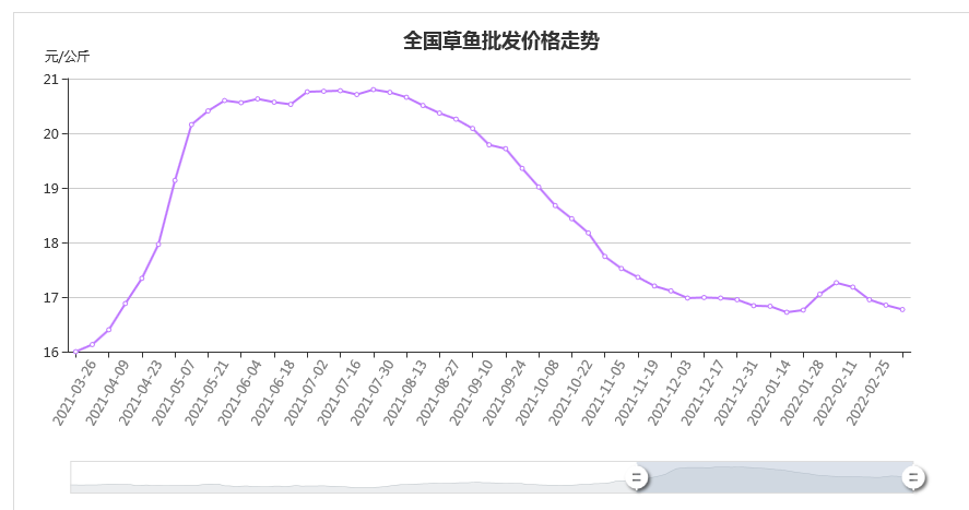 全國草魚批發價格尚處于低位(國家商務部數據中心)
