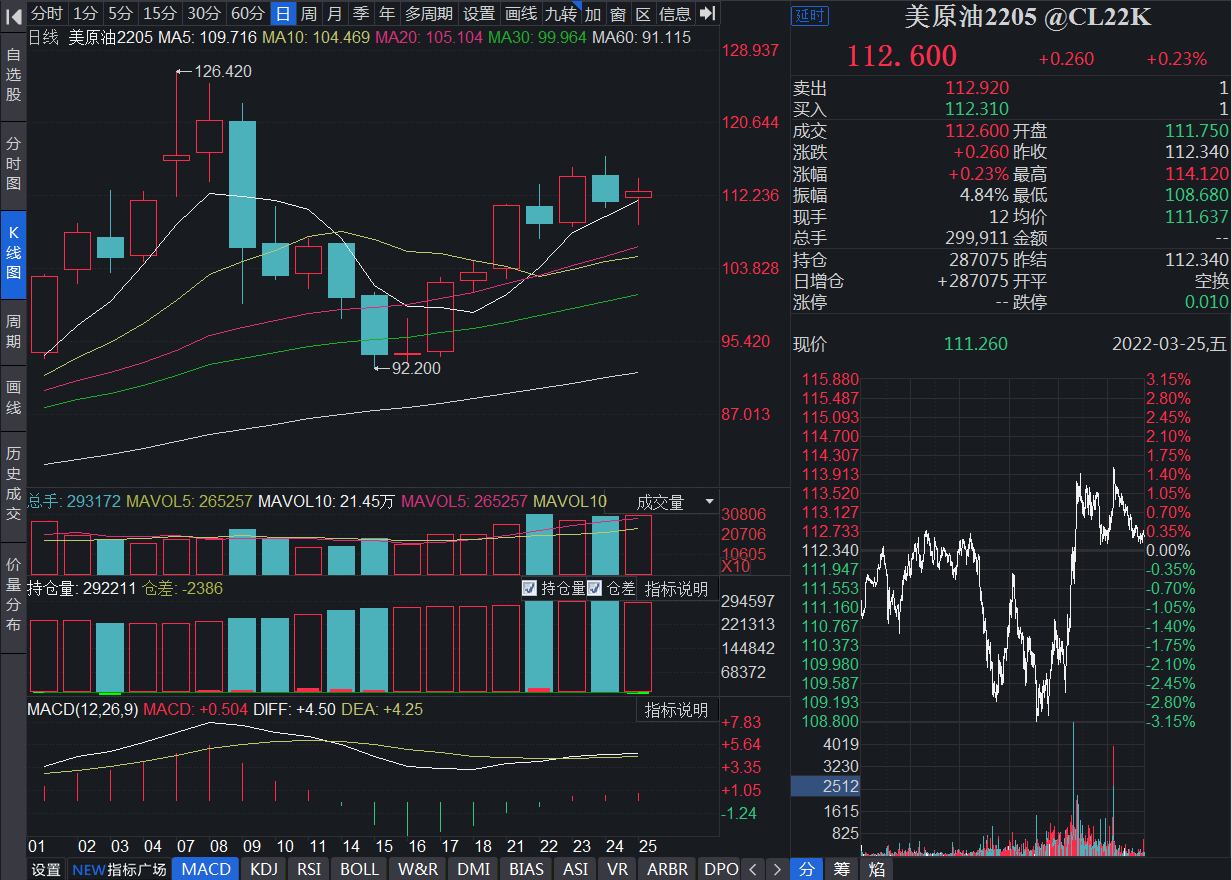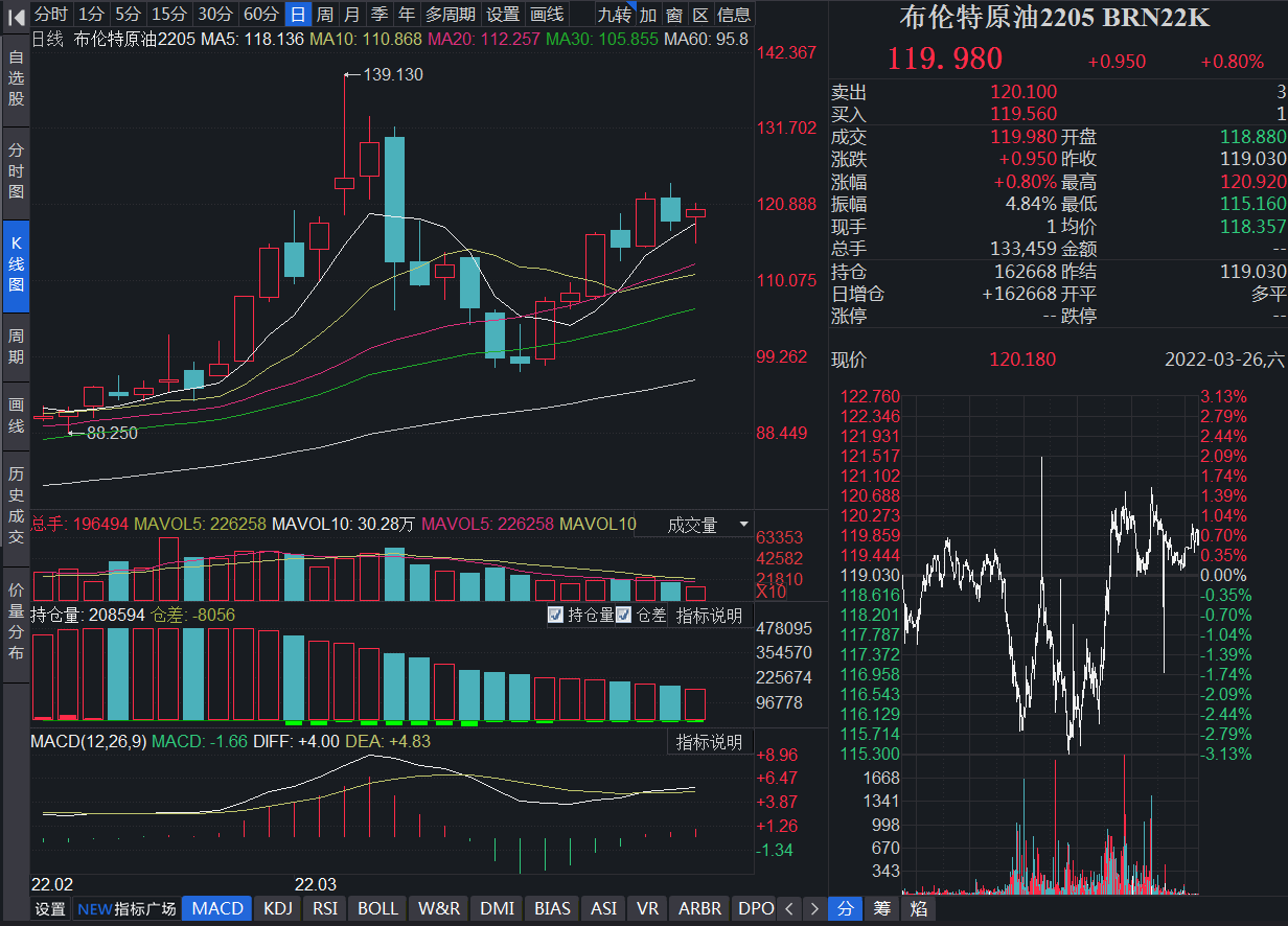 本周(3月21日至3月25日),國(guó)際油價(jià)結(jié)束了連續(xù)兩周的下跌行情,實(shí)現(xiàn)上漲。截至3月25日收盤,5月份交貨的NYMEXWTI原油期貨期間累計(jì)上漲9.02%,收于112.60美元/桶;5月份交貨的布倫特原油期貨期間累計(jì)上漲10.89%,收于119.98美元/桶;上期所原油期貨主力合約本周也累計(jì)上漲了7.21%,收于734.5元/噸。