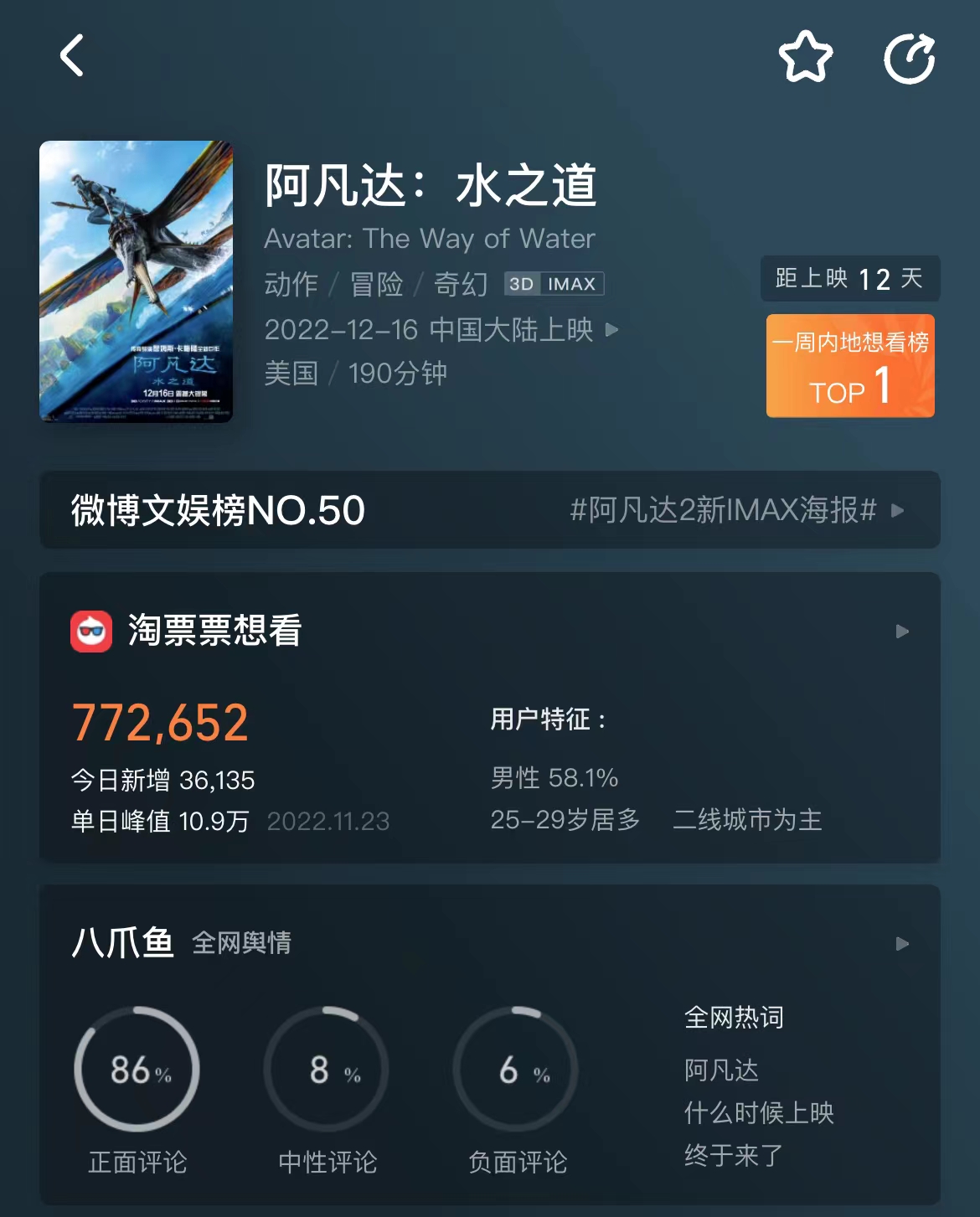 作為《阿凡達(dá)》續(xù)集,《阿凡達(dá)2》由美國光影風(fēng)暴娛樂制作,美國二十世紀(jì)影業(yè)公司出品,中國電影集團(tuán)公司引進(jìn),中國電影股份有限公司和華夏電影發(fā)行有限責(zé)任公司發(fā)行。淘票票數(shù)據(jù)顯示,截至12月4日晚7點(diǎn),已有77萬人想看,該數(shù)據(jù)仍在增加之中。
