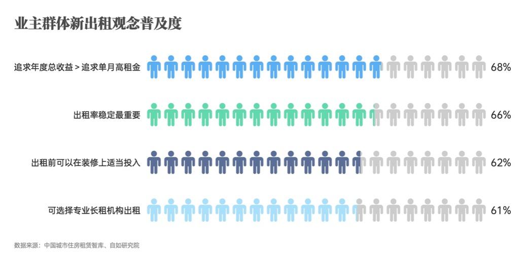 從業主咨詢、委托長租機構托管的增速高于整體市場的需求增速這一點來看,業主群體的專業出租意識以及對專業出租機構的偏好都在提升。