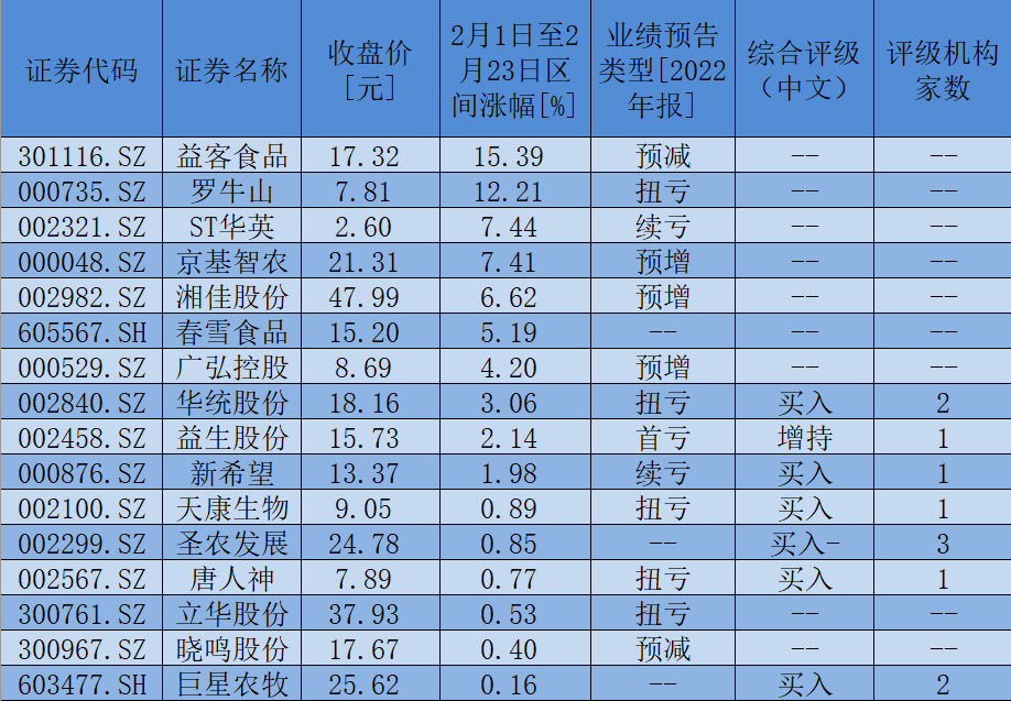 表:2月1日至2月23日,養雞概念板塊期間實現上漲個股一覽。