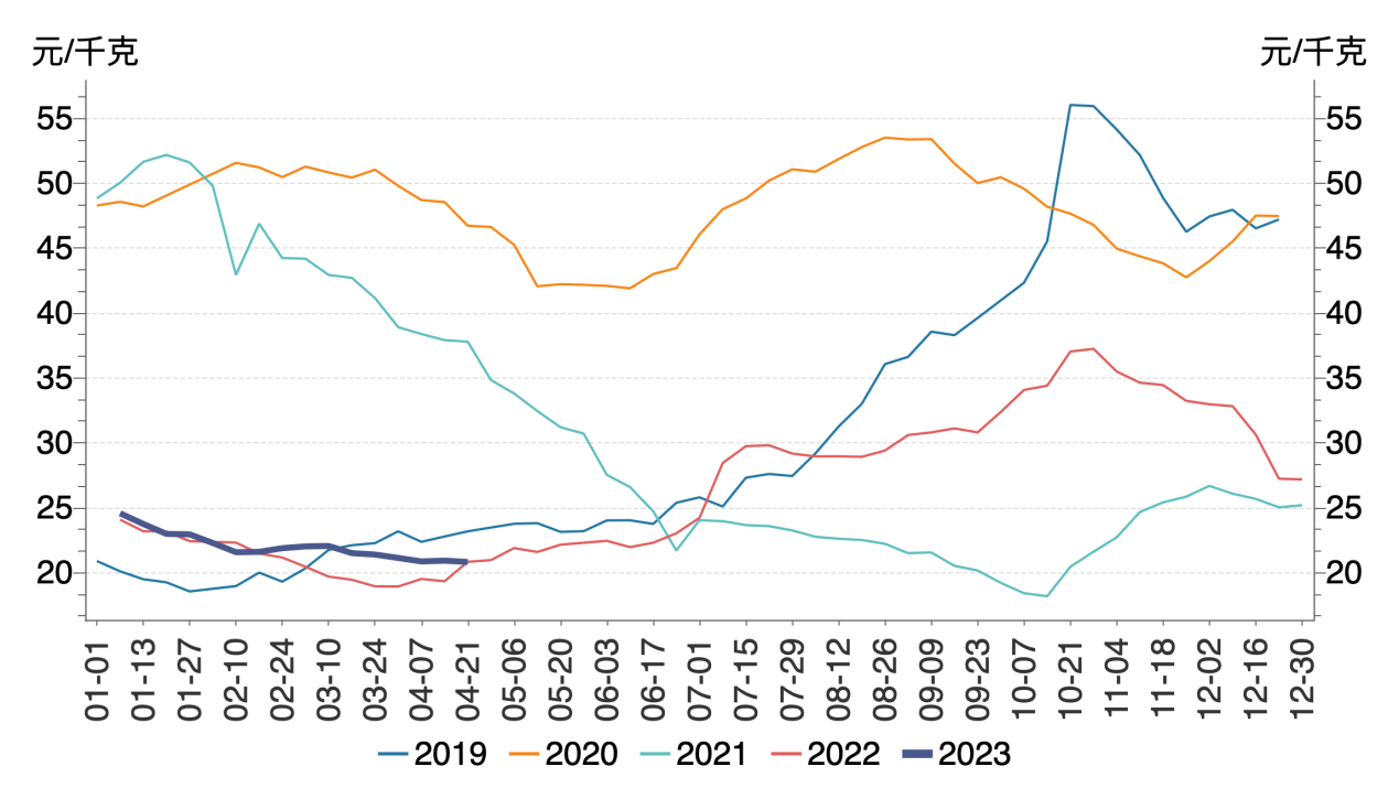 往后看,考慮到2022年的豬肉價格的高基數(shù)及2023年豬肉價格的低位運行周期,豬肉價格變化對于2023年通脹的影響或有限。根據(jù)2023年3月份數(shù)據(jù)的測算,豬肉在CPI中的權(quán)重為1.15%左右。按著前文預(yù)判,豬肉價格在2023年維持低位震蕩后將小幅走強。而2022年下半年豬肉價格出現(xiàn)過階段性走高,下半年的平均價格為31.42元/千克,遠高于2023年4月底的價格20.81元/千克(見圖10)。此外,2023年3月份的生豬存欄數(shù)量和能繁母豬數(shù)量比2022年同期分別增長2%和2.9%,這意味著2023年下半年的豬肉供給或高于2022年同期;而在需求端,2023年下半年經(jīng)濟復(fù)蘇的預(yù)期要強于2022年同期;在新的供需結(jié)構(gòu)以及豬肉收儲政策調(diào)節(jié)下,2023年下半年豬肉價格難以大幅高于2022年同期,大概率維持與去年相當(dāng)或略低的走勢。在豬肉價格同比增速不發(fā)生大波動的情況下,無論是按2023年前3月豬肉在CPI中的比重進行計算,還是按食品在CPI中的比重進行測算,那么由豬肉價格上漲帶動的通脹上行都極其有限。