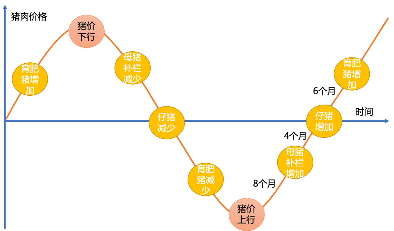 受市場供需的影響,豬肉價格通常表現(xiàn)出周期性。如圖3所示,在每一輪豬周期中,當(dāng)豬肉價格上行時,母豬的補欄開始增加,這個過程大概需要8個月的時間;母豬成熟后開始產(chǎn)仔,大概4個月左右后能夠產(chǎn)生新一代豬仔;豬仔在出生后,最快6個月左右可以投放至市場;農(nóng)戶如果看好未來豬肉價格,那么將會繼續(xù)飼養(yǎng)部分生豬育肥,延緩生豬向市場的投放,將豬肉供給后置,不過,育肥的時間可能隨市場供需結(jié)構(gòu)變化而有所調(diào)整;當(dāng)市場豬肉供給逐步開始超過需求后,豬肉價格將迎來下行周期,從而形成一個完整的豬周期。