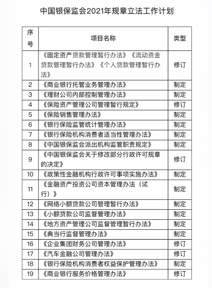 5月28日,銀保監會發布消息,為進一步完善銀行業保險業監管制度體系,做好2021年銀行業保險業監管規章立法工作,銀保監會制定了《中國銀保監會2021年規章立法工作計劃》(以下簡稱《立法計劃》),對全年的規章立法工作進行了總體部署。