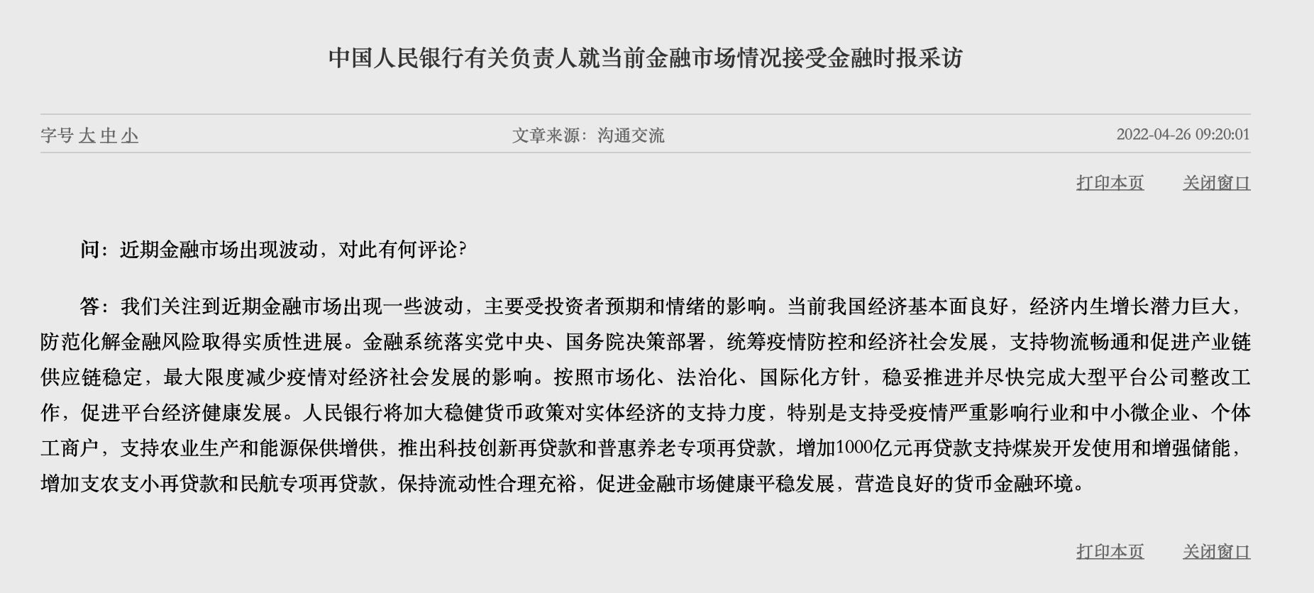 4月26日上午9時20分,中國人民銀行有關負責人就當前金融市場情況接受金融時報采訪時表示,人民銀行關注到近期金融市場出現一些波動,主要受投資者預期和情緒的影響。當前我國經濟基本面良好,經濟內生增長潛力巨大,防范化解金融風險取得實質性進展。
