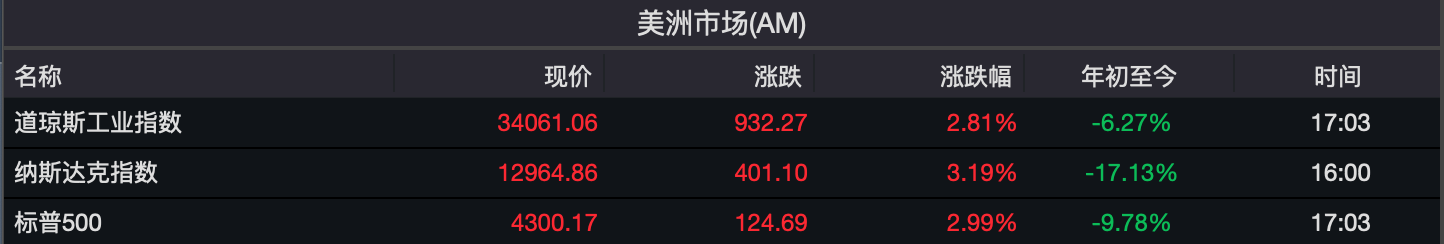在利率決議公布及鮑威爾講話提振后,美股三大指數大幅收漲,道指漲2.81%,納指漲3.19%,標普500指數漲2.99%。