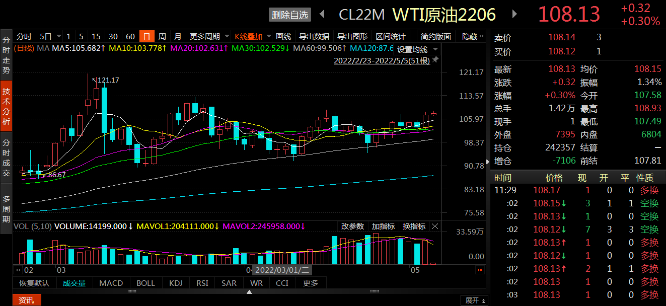 東方財富Choice數據顯示,截至北京時間2022年5月5日6:00,ICE布倫特原油期貨主力合約收于110.22美元/桶,上漲5.00%;截至北京時間2022年5月5日5:00,NYMEXWTI原油期貨主力合約收于107.55美元/桶,漲幅5.02%,期間最高上漲至108.61美元/桶,為4月18日以來新高。