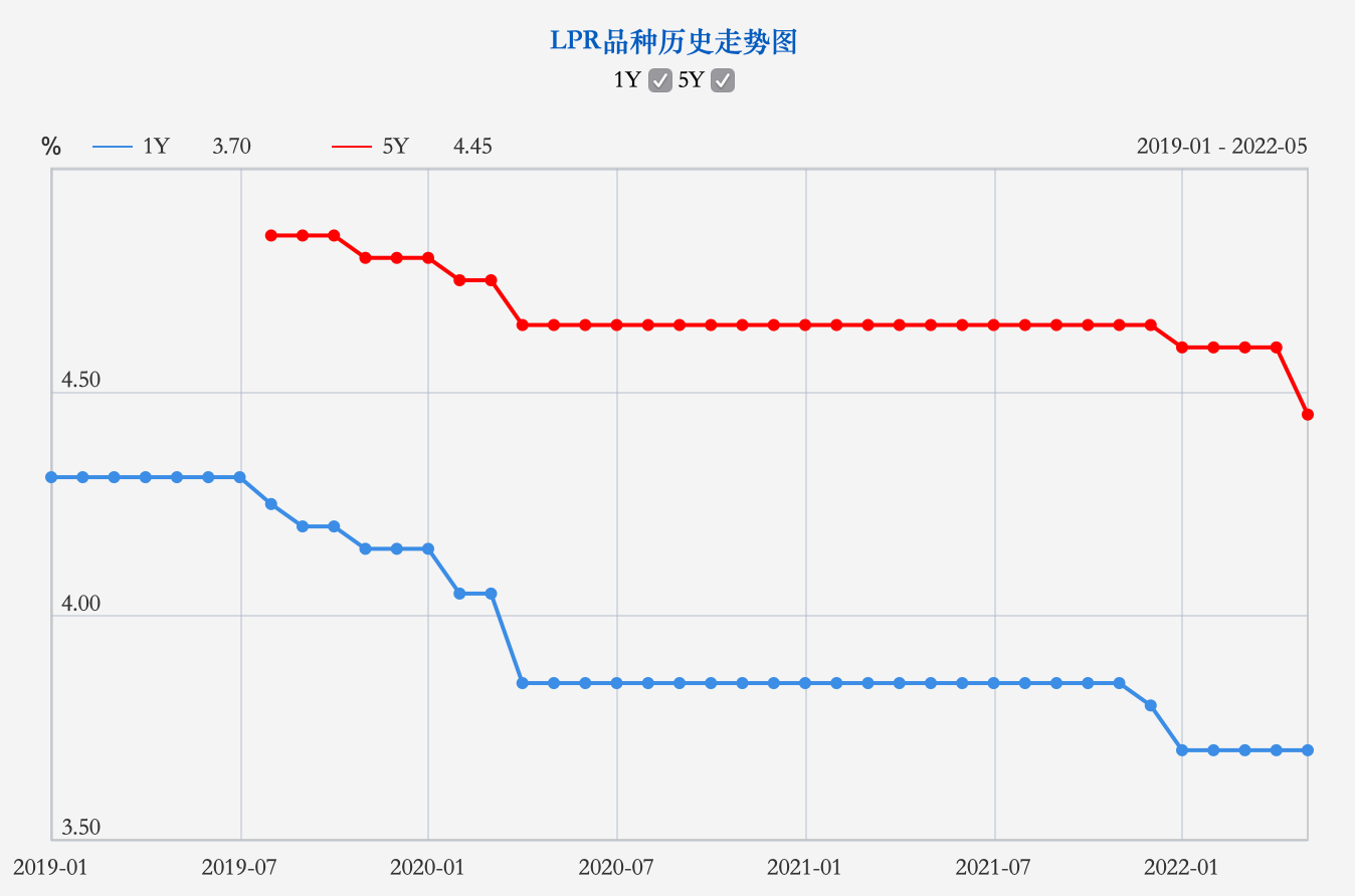 據(jù)中國人民銀行授權(quán)全國銀行間同業(yè)拆借中心公布,2022年5月20日貸款市場報價利率(LPR)為:1年期LPR為3.7%,5年期以上LPR為4.45%。二者前值分別為3.7%、4.6%。