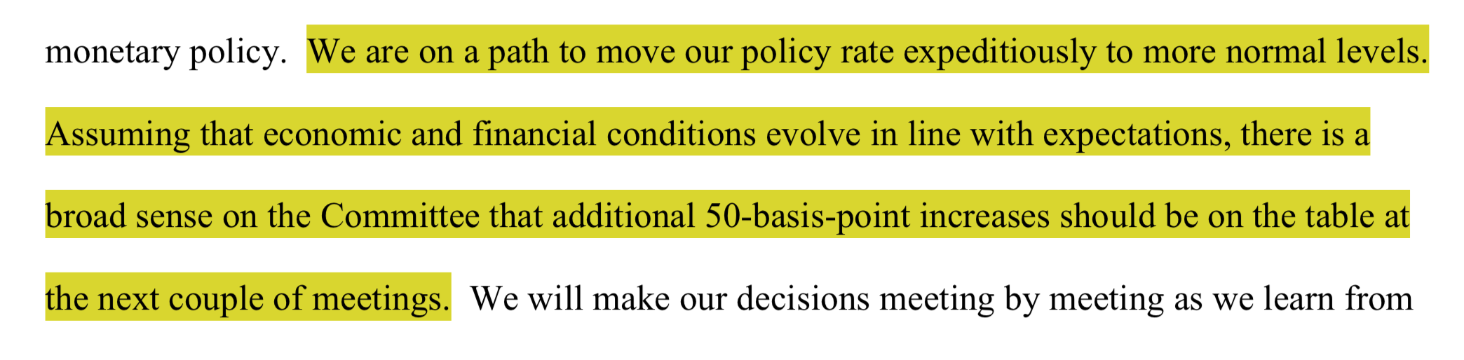美聯儲主席鮑威爾也在會后的新聞發布會上談道,“我們正在將政策利率迅速提高到更正常的水平,假設經濟和金融狀況的發展符合預期,委員會普遍認為,在接下來的幾次會議上應該考慮再增加50個基點”。