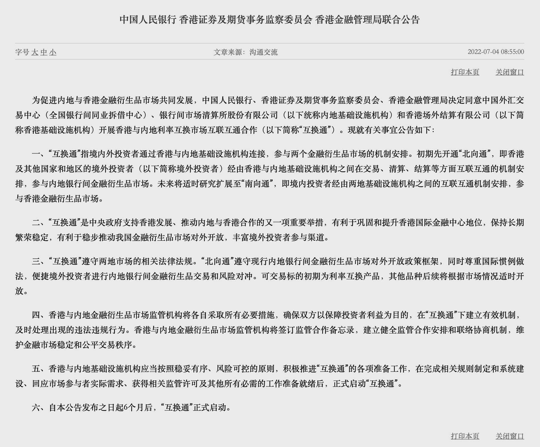 7月4日,中國人民銀行發布消息,為促進內地與香港金融衍生品市場共同發展,中國人民銀行、香港證券及期貨事務監察委員會(下稱“香港證監會”)、香港金融管理局(下稱“香港金管局”)決定同意中國外匯交易中心(全國銀行間同業拆借中心)、銀行間市場清算所股份有限公司和香港場外結算有限公司開展香港與內地利率互換市場互聯互通合作(下稱“互換通”)。