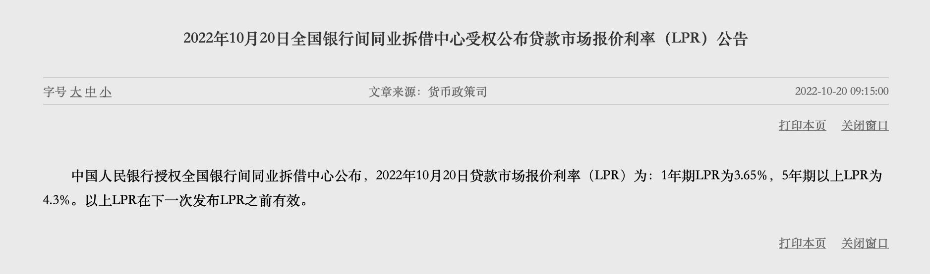 10月20日,最新一期市場(chǎng)報(bào)價(jià)利率(LPR)出爐。中國人民銀行授權(quán)全國銀行間同業(yè)拆借中心公布:1年期LPR為3.65%,5年期以上LPR為4.3%。