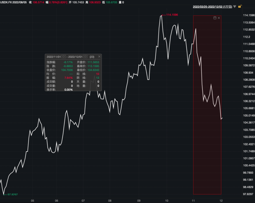 12月1日歐洲交易時段盤中,美元指數(shù)快速回落至105關(guān)口下方,跌幅一度超1%,盤中最低下探至104.5607,創(chuàng)今年6月末以來新低。Wind數(shù)據(jù)顯示,11月1日至12月1日,美元指數(shù)已累計下跌約6.17%。截至12月2日記者發(fā)稿,美元指數(shù)報104.8071,仍處于105下方,較9月27日創(chuàng)下的年內(nèi)最高點114.4777,已回落約8.4%。