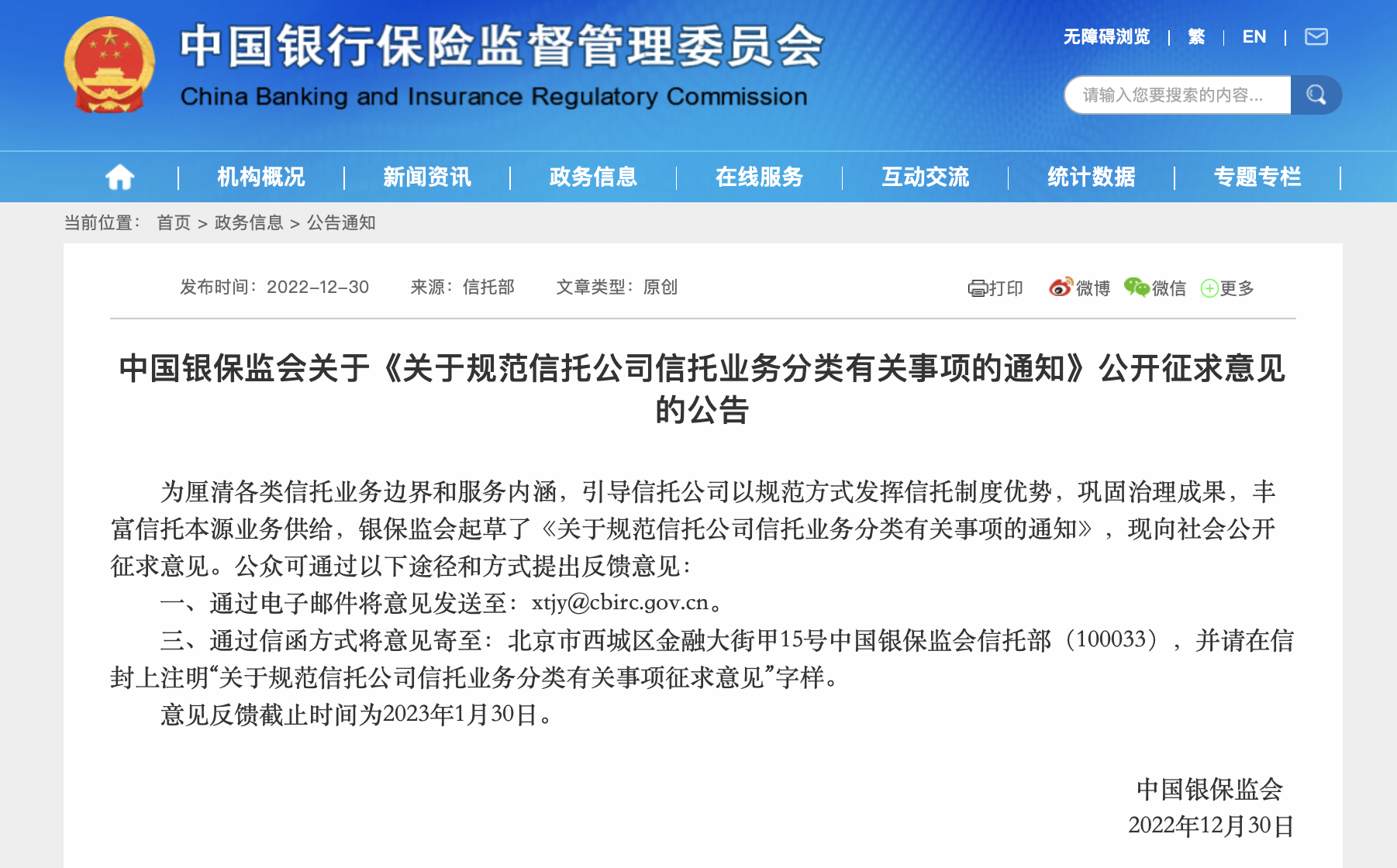 12月30日,銀保監會官網發布《關于規范信托公司信托業務分類有關事項的通知(征求意見稿)》(以下簡稱《通知》)。