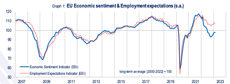 2月27日18時,由歐盟經濟和財政事務委員會編撰的經濟景氣指數報告(以下簡稱“報告”)出爐,2月份,歐盟、歐元區經濟景氣指數基本與前月持平,其中歐盟地區為97.8,與1月份水平一致。歐元區經濟景氣指數則小幅下降0.1,錄得99.7。