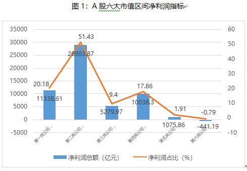 2022年,A股市場頭部效應(yīng)顯著,高市值上市公司經(jīng)營業(yè)績表現(xiàn)極為優(yōu)秀。將A股上市公司按照市值分成六大區(qū)間(見下表),數(shù)據(jù)顯示,千億市值以上的上市公司數(shù)量為122家,占比2.41%,市值規(guī)模達到34.71萬億元,占比40.99%。從盈利指標來看,千億級上市公司的營業(yè)收入總額達到32.35萬億元,占比45.38%;凈利潤總額達到4.02萬億元,占比71.61%。其中,萬億市值以上的上市公司有5家,分別為貴州茅臺、工商銀行、建設(shè)銀行、中國移動、農(nóng)業(yè)銀行,其合計總市值、營業(yè)收入、凈利潤分別為6.76萬億元,3.53萬億元和1.13萬億元,占A股上市公司相同指標總額的比重分別為7.99%、4.95%和20.18%;其平均凈利潤和營業(yè)收入分別達到2267.72億元和7053.38億元,均遠超其他類別的上市公司。