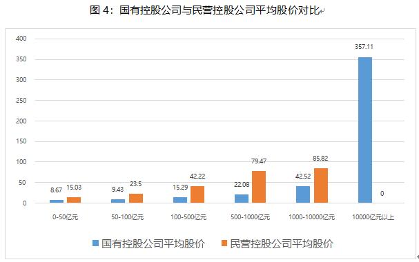 但是,對比國有控股公司和民營控股公司的盈利表現(xiàn)來看,我們發(fā)現(xiàn):(1)從平均凈資產(chǎn)收益率指標看,市值在100-500億元和1000-10000億元的兩類區(qū)間中(2022年底,民營控股公司沒有萬億市值以上的公司),國有控股上市公司的平均凈資產(chǎn)收益率都低于民營控股公司的相同指標,特別是在市值1000-10000億元的區(qū)間中,民營控股公司的平均凈資產(chǎn)收益率是國有控股公司系統(tǒng)指標的1.79倍。(2)從平均利息費用指標看,國有控股公司的利息費用在所有市值區(qū)間,都明顯公司高于民營控股公司,特別是,在市值500-1000億元的區(qū)間中,國有控股公司的平均利息費用15.93億元,民營控股公司的平均利息費用是5.16億元,前者是后者的3.09倍。在市值1000-10000億元的區(qū)間中,國有控股公司的平均利息費用是38.52億元,民營控股公司的相同指標是8.88億元,前者是后者的4.34倍。(3)從PE倍數(shù)看,在市值500億元以下的區(qū)間中,國有控股公司的平均PE都高于民營控股公司,但是,在市值500-1000億元和1000-10000億元的兩個區(qū)間中,國有控股公司的平均PE分別為41.32倍和18.58倍,都明顯低于民營控股公司的平均PE的81.03倍和53.47倍。(4)從平均股價看,無論在哪一類市值區(qū)間,國有控股公司的股價都低于民營控股公司的股價,其中,在500-1000億元市值區(qū)間,民營控股公司的平均股價79.47元,甚至達到國有控股公司相同指標(22.08元)的3.60倍;在市值1000-10000億元區(qū)間內(nèi),民營控股公司的平均股價85.82元是國有控股公司相同指標(42.52元)的2.02倍。