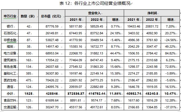 按照申萬行業(yè)分類并對比各行業(yè)的業(yè)績指標,2022年上市公司凈利潤總額排名前十的行業(yè)分別為銀行、石油石化、非銀金融、煤炭、電力設(shè)備、建筑裝飾、電力設(shè)備、有色金屬、基礎(chǔ)化工、醫(yī)藥生物和通信。十大行業(yè)上市公司總數(shù)為1825家,占A股公司總量的36.05%,總市值合計為42.55萬億元,占比50.25%;營業(yè)收入41.68萬億元,占比58.47%;凈利潤4.52萬億元,占比80.43%。其中,得益于中國綠色能源版圖快速擴容和新能源技術(shù)快速發(fā)展等因素,電力設(shè)備和有色金屬兩大行業(yè)的創(chuàng)利創(chuàng)收水平表現(xiàn)優(yōu)異,兩者均實現(xiàn)了營收凈利的雙增長,且同比增速超過其他大部分行業(yè)。