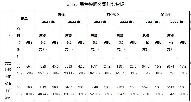 2022年,民營控股公司依舊是資本市場的主力軍,公司數(shù)量達3363家,占上市公司總數(shù)的66.42%,總市值達35.84萬億元,占A股總市值的42.32%。此外,民營控股公司的成長活力也獲得持續(xù)激發(fā),營業(yè)收入的占比從24.24%增至25.31%,凈利潤的占比從16.94%增至17.22%,創(chuàng)收創(chuàng)利水平穩(wěn)定上升,為上市公司發(fā)展積聚了內(nèi)在動力。2022年,民營控股公司繳納了0.88萬億稅費,占上市公司繳納稅費總額的18.45%。