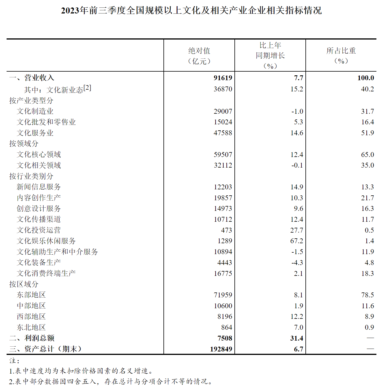10月30日,國家統計局發布數據,據對全國7.2萬家規模以上文化及相關產業企業(以下簡稱“文化企業”)調查,2023年前三季度,文化企業實現營業收入91619億元,按可比口徑計算,比上年同期增長7.7%。其中,文化新業態特征較為明顯的16個行業小類實現營業收入36870億元,比上年同期增長15.2%,快于全部規模以上文化企業7.5個百分點。