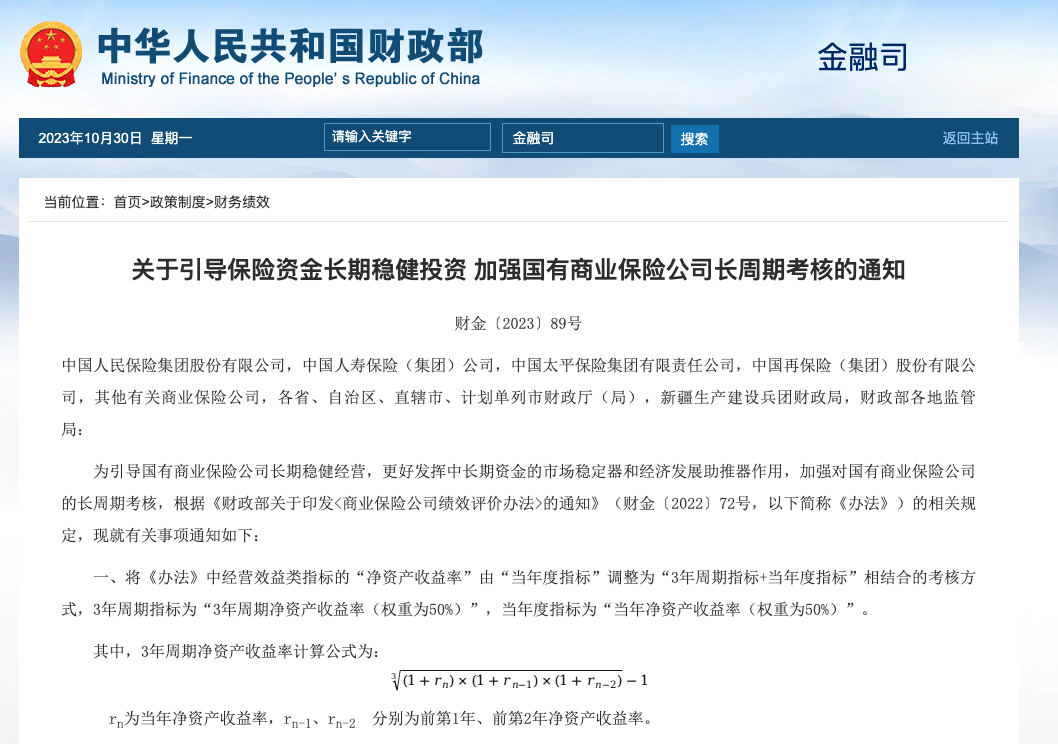 為引導國有商業保險公司長期穩健經營,更好發揮中長期資金的市場穩定器和經濟發展助推器作用,加強對國有商業保險公司的長周期考核,財政部網站10月30日發布《關于引導保險資金長期穩健投資加強國有商業保險公司長周期考核的通知》(以下簡稱《通知》)。