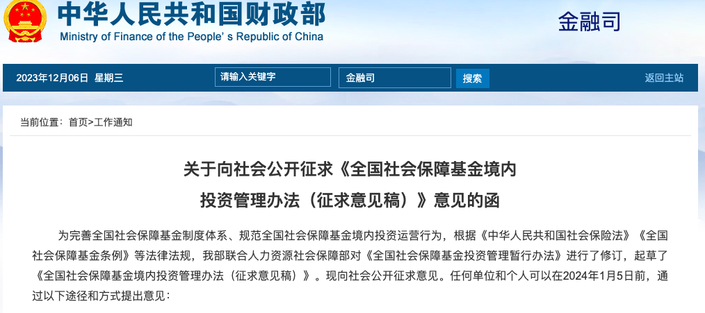 據財政部網站12月6日消息,為完善全國社會保障基金制度體系、規范全國社會保障基金境內投資運營行為,根據《中華人民共和國社會保險法》《全國社會保障基金條例》等法律法規,財政部聯合人力資源社會保障部對《全國社會保障基金投資管理暫行辦法》進行了修訂,起草了《全國社會保障基金境內投資管理辦法(征求意見稿)》(以下簡稱《管理辦法》)。現向社會公開征求意見。