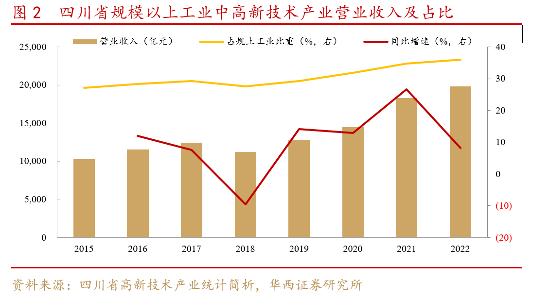 高技術產業支撐工業高質量發展。產業發展思路上看,成渝兩地均以科技創新驅動發展為導向,積極推進落后傳統產業轉型升級,推動制造業高質量發展,培育戰略性新興產業和現代服務業,從而加快推進現代產業體系構建。這幾年川渝地區高技術產業對工業高質量發展的支撐效應開始逐步顯現。以四川省為例,2022年四川省高新技術產業總實現營業收入2.65萬億,同比增長12.3%;納入高新技術產業統計的規上工業企業2022年營業收入達到1.98萬億元,同比增長6.0%,高于規上工業整體增速2.4個百分點,對規上工業營業收入增長的貢獻率達58.1%,在規上工業營業收入中的占比從2015年27.1%上升至36.0%。
