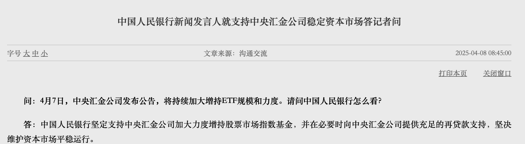 4月8日,中國人民銀行新聞發言人就支持中央匯金公司穩定資本市場答記者問表示,中國人民銀行堅定支持中央匯金公司加大力度增持股票市場指數基金,并在必要時向中央匯金公司提供充足的再貸款支持,堅決維護資本市場平穩運行。