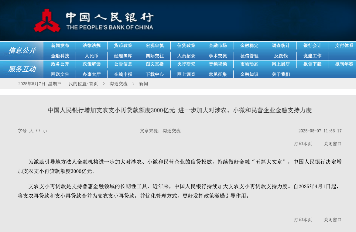 本報訊 (記者韓昱)中國人民銀行5月7日發布消息稱,為激勵引導地方法人金融機構進一步加大對涉農、小微和民營企業的信貸投放,持續做好金融“五篇大文章”,中國人民銀行決定增加支農支小再貸款額度3000億元。