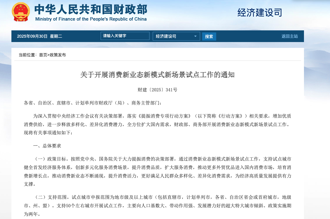 財政部9月30日發布消息稱,為深入貫徹中央經濟工作會議有關決策部署,落實《提振消費專項行動方案》相關要求,增加優質消費供給,進一步釋放多樣化、差異化消費潛力,全方位擴大國內需求,財政部、商務部聯合印發了《關于開展消費新業態新模式新場景試點工作的通知》。