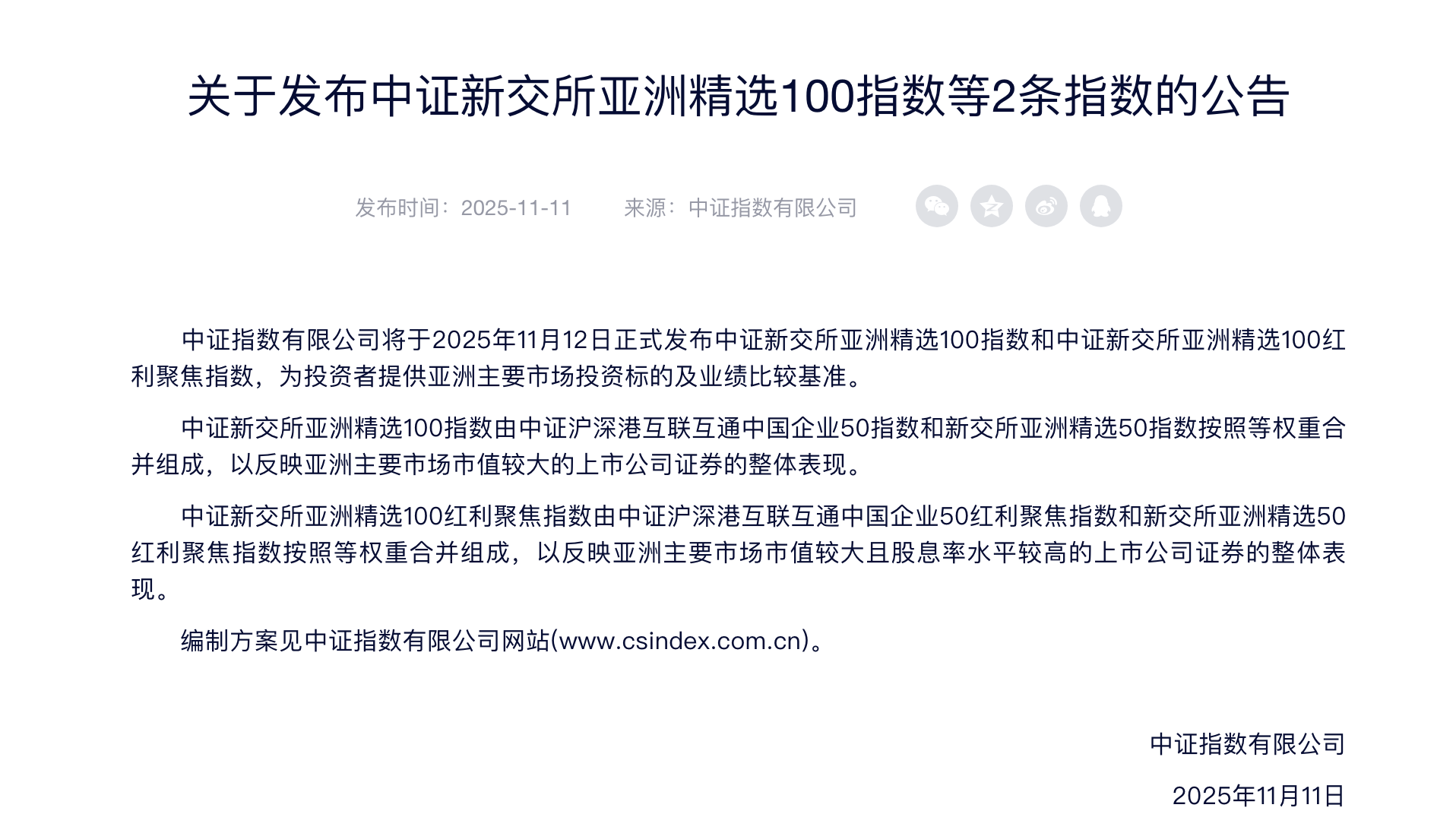 本報訊 (記者毛藝融)11月11日,中證指數有限公司在官網公告稱,將于2025年11月12日正式發布中證新交所亞洲精選100指數和中證新交所亞洲精選100紅利聚焦指數,為投資者提供亞洲主要市場投資標的及業績比較基準。