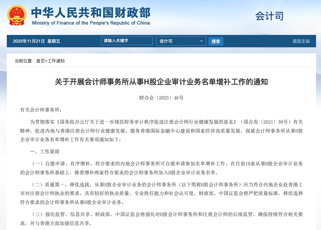 財政部11月21日發布消息稱,為貫徹落實《國務院辦公廳關于進一步規范財務審計秩序促進注冊會計師行業健康發展的意見》(國辦發〔2021〕30號)有關精神,促進內地與香港注冊會計師行業健康發展,服務香港國際金融中心建設和國家經濟高質量發展,近日,財政部、中國證監會聯合印發了《關于開展會計師事務所從事H股企業審計業務名單增補工作的通知》(財辦會〔2025〕46號,以下簡稱《通知》)?!锻ㄖ芬幎斯ぷ髟瓌t、申報要求、申請材料、工作程序和監管要求等。
