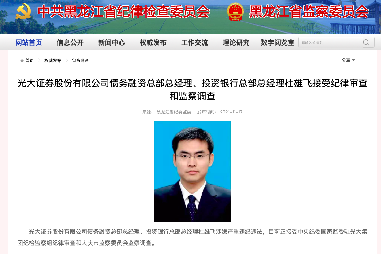 11月17日,黑龍江省紀委監委網站顯示,光大證券股份有限公司債務融資總部總經理、投資銀行總部總經理杜雄飛涉嫌嚴重違紀違法,目前正接受中央紀委國家監委駐光大集團紀檢監察組紀律審查和大慶市監察委員會監察調查。