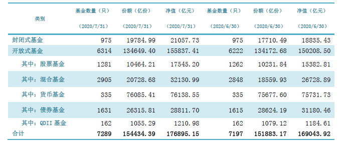 具體來看,據中國基金業協會發布的《公募基金市場數據(2020年7月)》顯示,開放式基金中,股票基金數量有1281只,凈值為17545.2億元,環比增長14.06%;混合基金2905只,凈值為32130.99億元,環比增長20.21%。貨幣基金和QDII基金規模也出現了小幅上漲,凈值分別為76138.55億元和1210.98億元,較6月末增長了0.54%和2.23%。