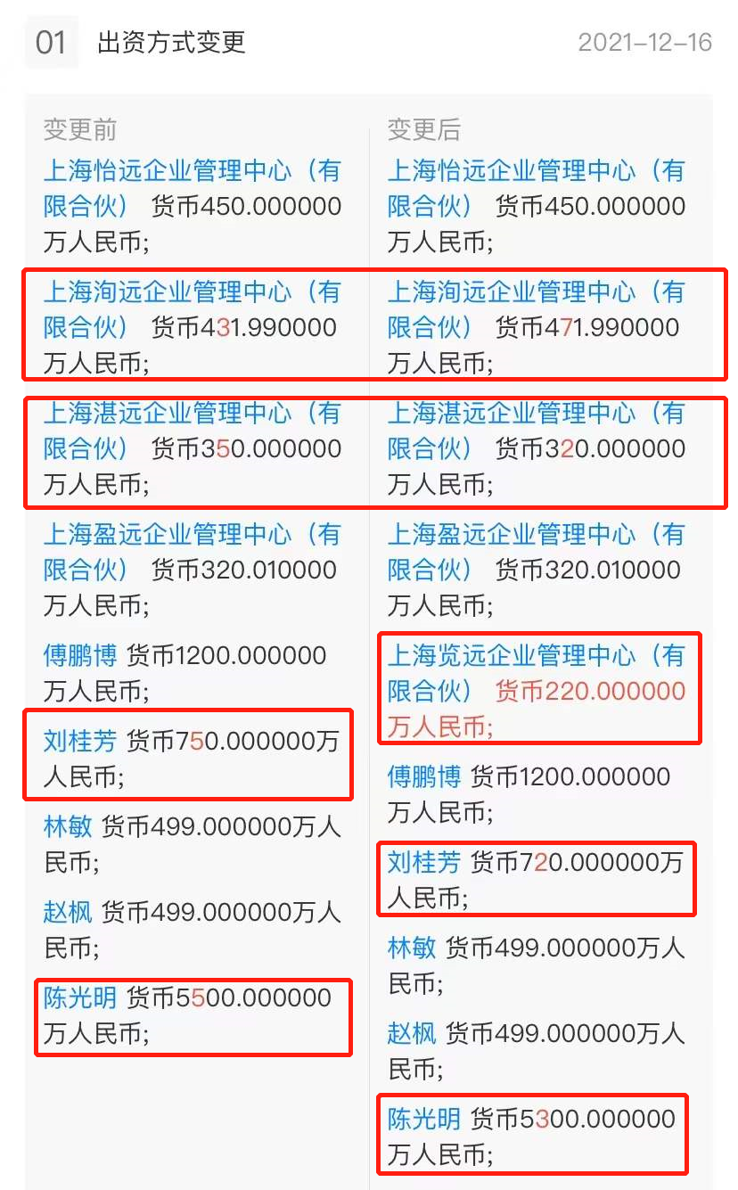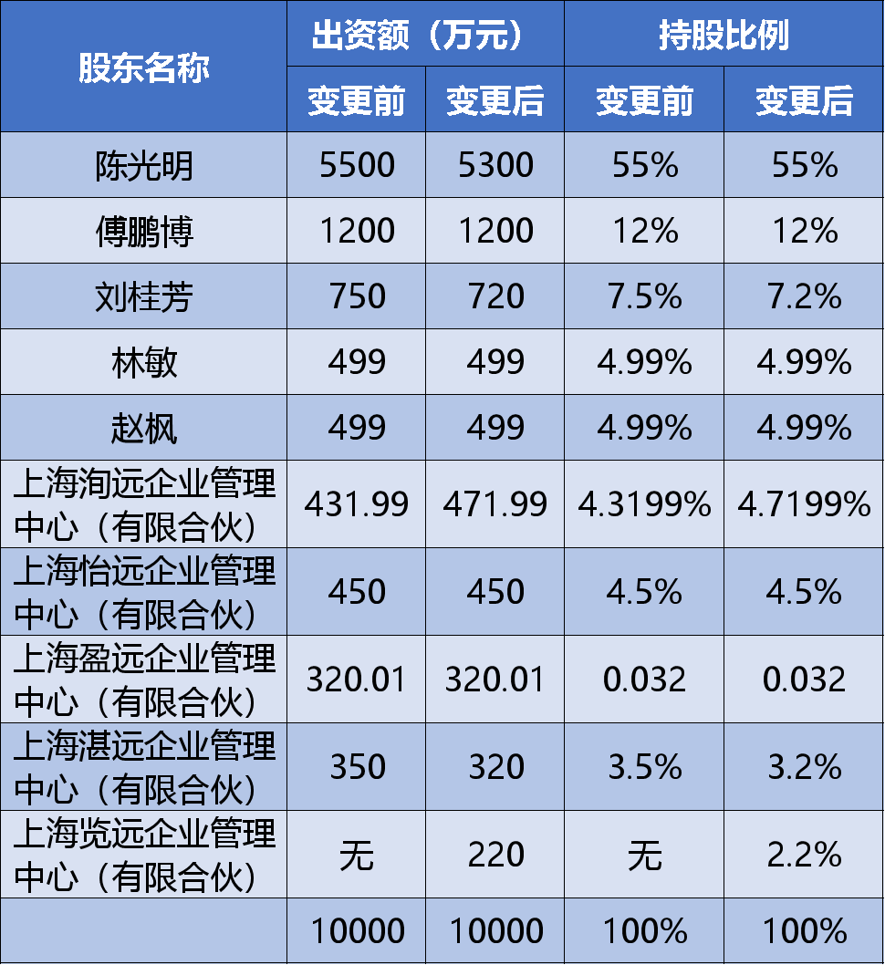 天眼查網站顯示,睿遠基金在2021年12月16日完成投資人(股權)變更,新增了上海覽遠企業管理中心(有限合伙)這一新的員工持股平臺。與之相對的是,公司總經理陳光明、董事長劉桂芳在內的幾個股東出資額小幅下滑。