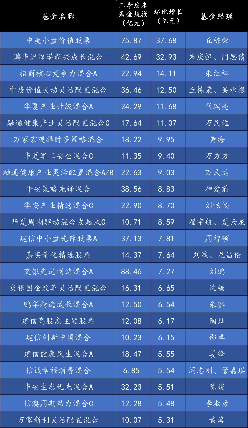 在三季度期間規模增長超10億元的還有朱紅裕管理的招商核心競爭力混合A、代瑞亮管理的華夏產業升級混合A、萬民遠管理的融通健康產業靈活配置混合C和今年以來一直穩居業績前列的黃海所管理的萬家宏觀擇時多策略混合。