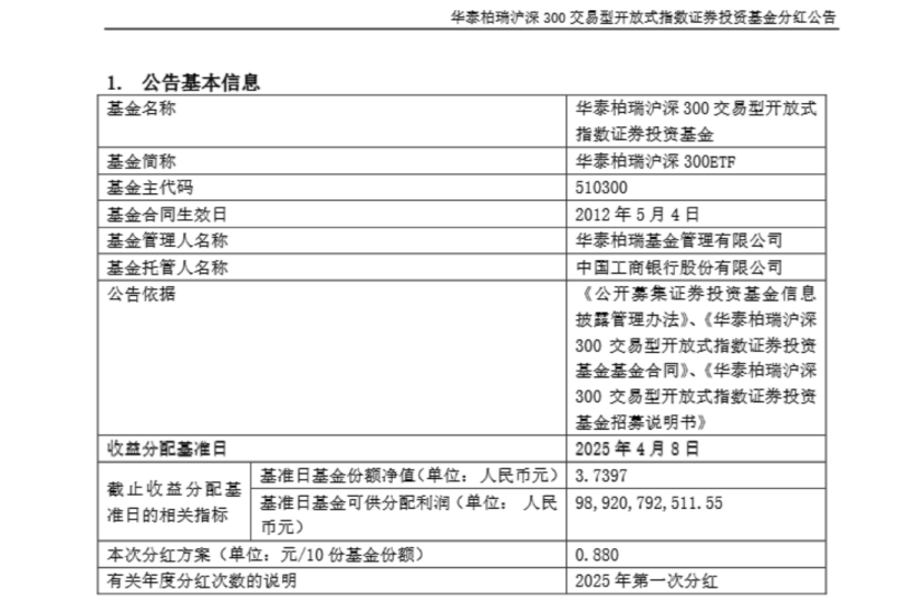6月11日,華泰柏瑞基金發(fā)布公告稱,旗下滬深300ETF將實(shí)施現(xiàn)金分紅,分紅方案為每10份基金份額分紅0.880元,分紅權(quán)益登記日為2025年6月17日,除息日為2025年6月18日,現(xiàn)金紅利發(fā)放日為2025年6月27日。