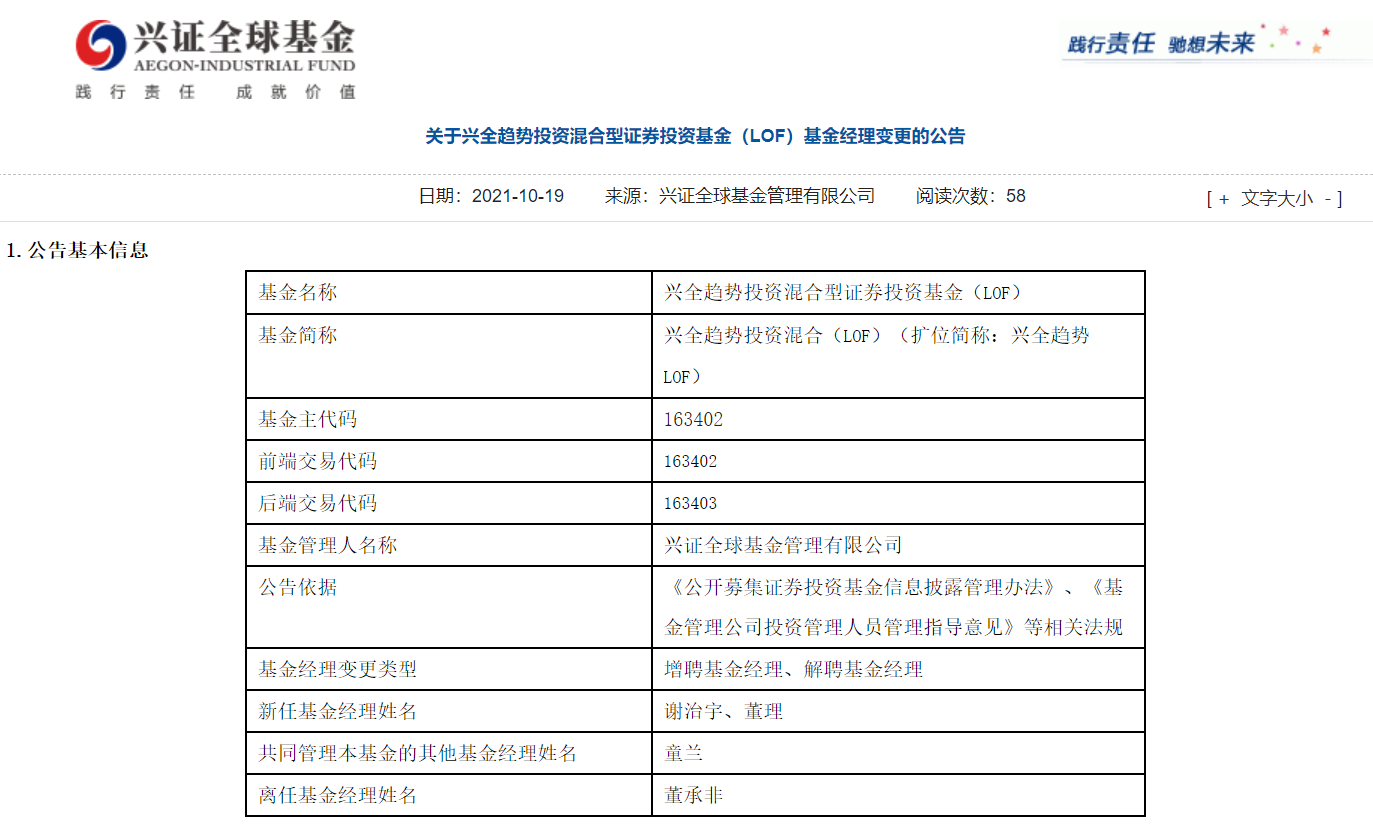 公告顯示,董承非在管基金將由興證全球基金另一“名將”謝治宇接棒。