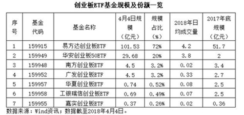 目前,已上市交易的創(chuàng)業(yè)板ETF共有七只。據(jù)Wind數(shù)據(jù)統(tǒng)計(jì)顯示,這七只創(chuàng)業(yè)板ETF在4月4日的總份額合計(jì)為107.62億份,較2017年底43.23億份的總份額增長(zhǎng)了148.9%。其中,易方達(dá)創(chuàng)業(yè)板ETF是目前市場(chǎng)上最大的創(chuàng)業(yè)板ETF,規(guī)模占比72%,遠(yuǎn)遠(yuǎn)超過其它六只產(chǎn)品。同時(shí),該基金今年以來在二級(jí)市場(chǎng)的日均成交量4.2億,是市場(chǎng)成交最活躍的ETF。