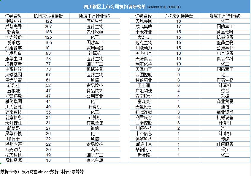 在機(jī)構(gòu)調(diào)研榜單中,6家川股上市公司今年前三季度獲百家以上機(jī)構(gòu)扎堆調(diào)研。其中,康弘藥業(yè)、成都先導(dǎo)、新希望、國(guó)光股份、愛樂達(dá)分別以422家、267家、186家、125家、105家的機(jī)構(gòu)調(diào)研數(shù)量,入圍今年前三季度川股最受機(jī)構(gòu)投資者關(guān)注排行榜的前五名。