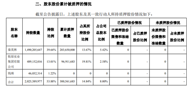 董事長秦英林質押股份1.28億股