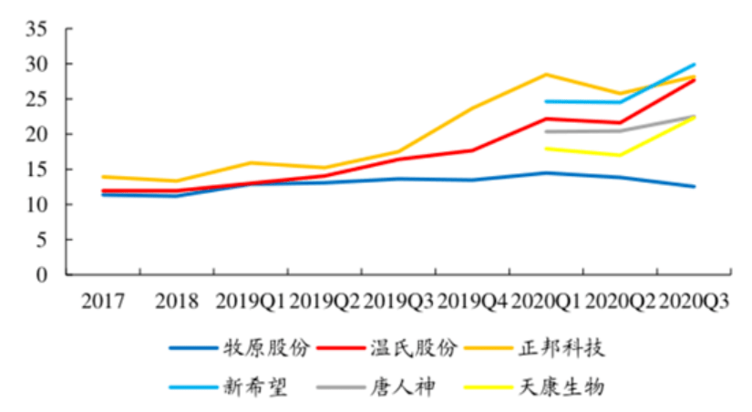 因此,未來以牧原為主的龍頭豬企或?qū)⑼ㄟ^“以量換價”形式,提升行業(yè)集中度。2020Q1-Q3牧原股份、新希望、正邦科技、溫氏股份紛紛加速推進(jìn)擴(kuò)張,資本開支大幅增長,分別同比增長441%、374%、250%、203%。