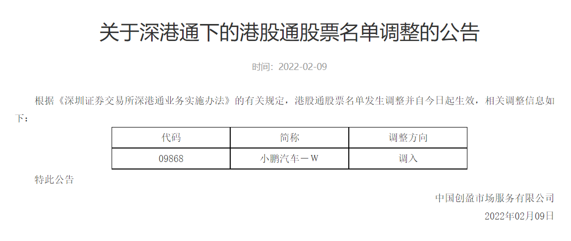 2月9日,深交所發(fā)布公告稱,根據(jù)《深圳證券交易所深港通業(yè)務(wù)實(shí)施辦法》的有關(guān)規(guī)定,將小鵬汽車(9868.HK)納入深港通下的港股通股票名單,自2月9日起正式生效。受此利好消息提振,9日收盤,小鵬汽車報(bào)收152.50港元,漲幅達(dá)8%。2月10日,小鵬汽車?yán)^續(xù)上漲3.08%,最新市值2692億港元。